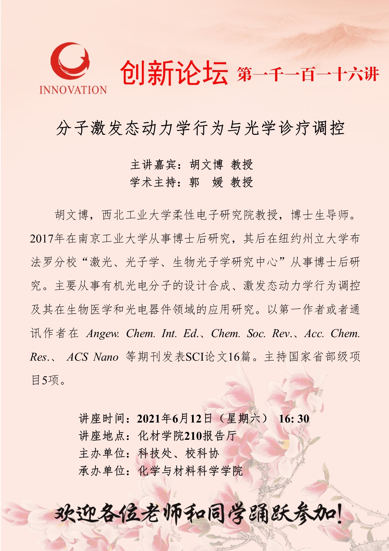 胡文博 教授 伟德国际1949始于英国创新论坛第一千一百一十六讲:分子激发态动力学行为与光学诊疗调控 讲座时间 2021年6月12日(星期六) 16:30 讲座地点 化材学院210报告厅 讲座人介绍 胡文博 教授 讲座内容