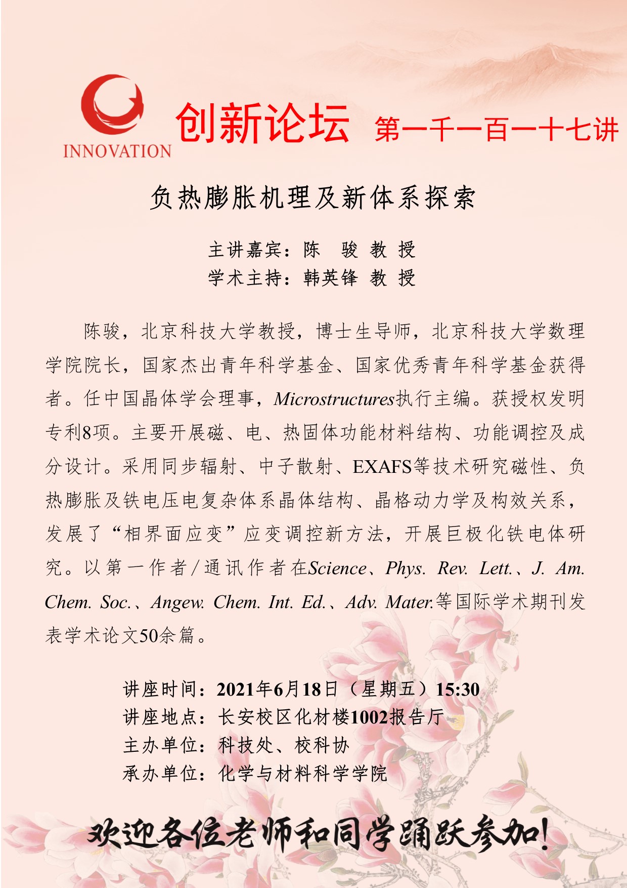 陈骏 教授 伟德国际1949始于英国创新论坛第一千一百一十七讲:负热膨胀机理及新体系探索 讲座时间 2021年6月18日(星期五)15:30 讲座地点 长安校区化材楼1002报告厅 讲座人介绍 陈骏 教授 讲座内容