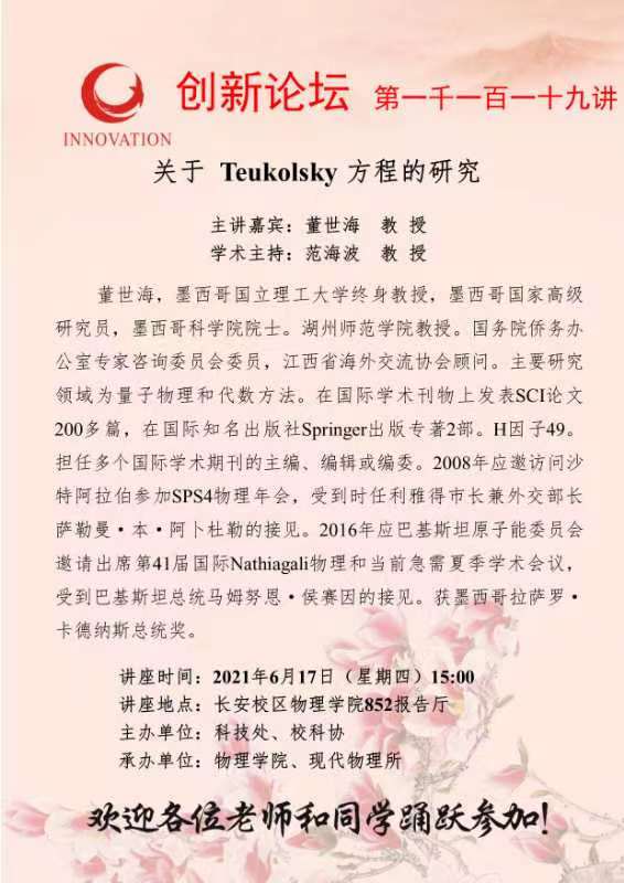 董世海 教 授 伟德国际1949始于英国创新论坛第一千一百一十九讲:关于 Teukolsky 方程的研究 讲座时间 2021年6月17日(星期四)15:00 讲座地点 长安校区物理学院852报告厅 讲座人介绍 董世海 教 授 讲座内容