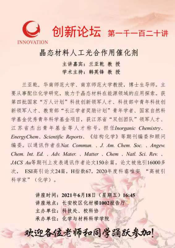 兰亚乾 教 授 伟德国际1949始于英国创新论坛第一千一百二十讲:晶态材料人工光合作用催化剂 讲座时间 2021年6月18日(星期五)16:45 讲座地点 长安校区化材楼1002报告厅 讲座人介绍 兰亚乾 教 授 讲座内容