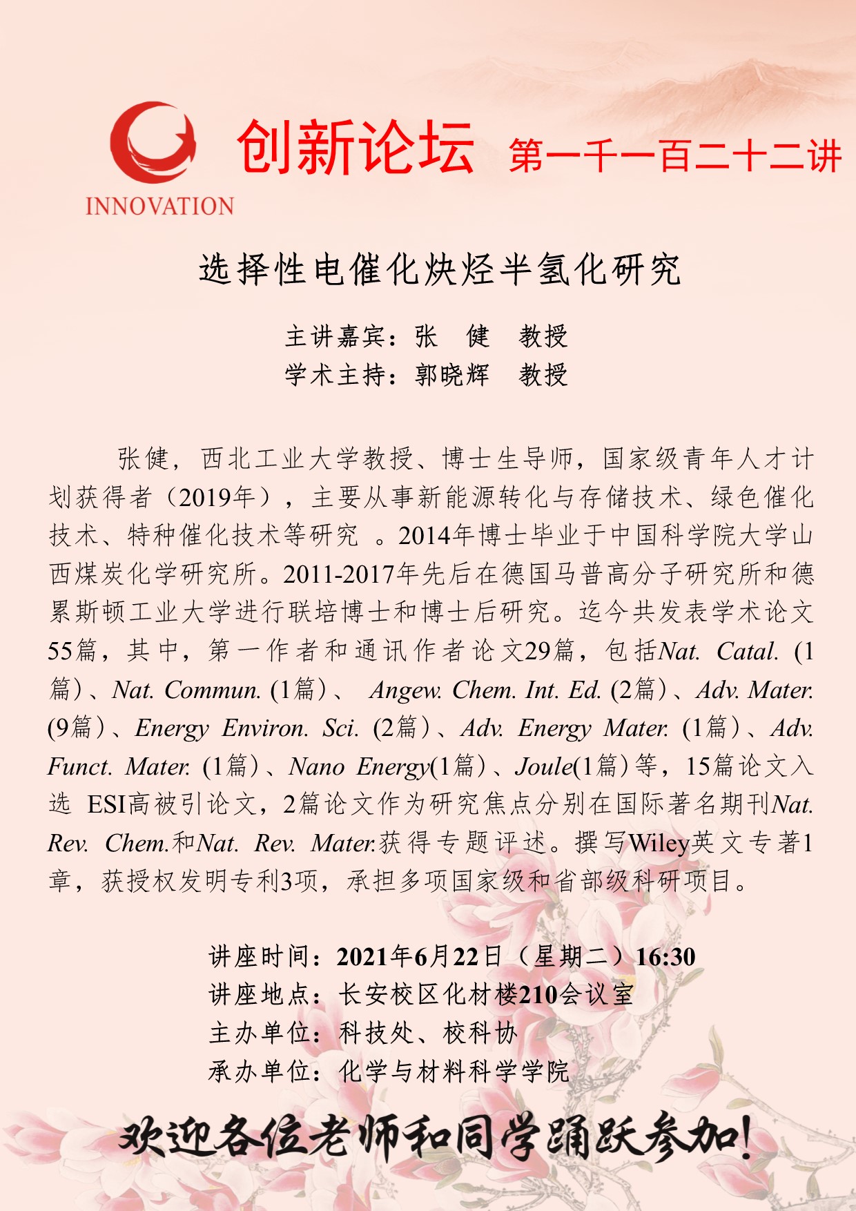张 健 教授 伟德国际1949始于英国创新论坛第一千一百二十二讲:选择性电催化炔烃半氢化研究 讲座时间 2021年6月22日(星期二)16:30 讲座地点 长安校区化材楼210会议室 讲座人介绍 张 健 教授 讲座内容