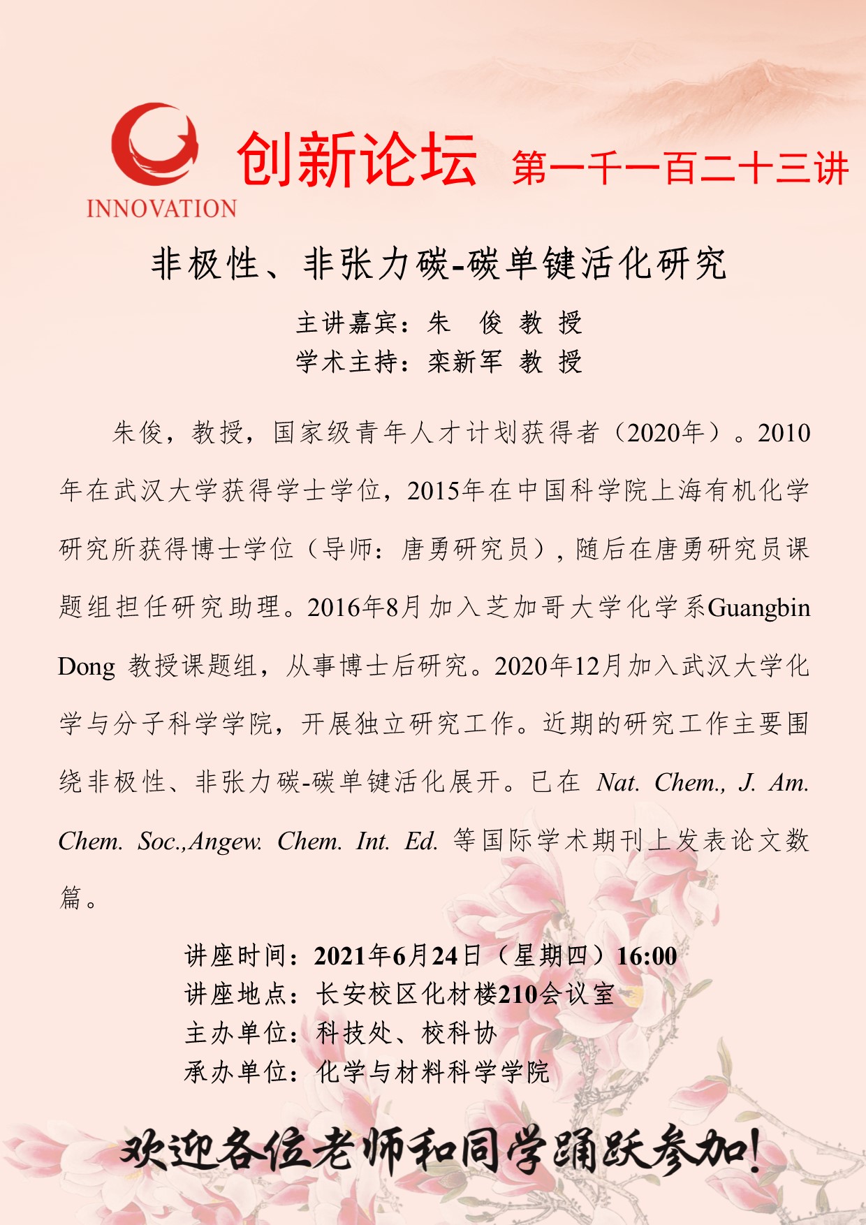 朱 俊 教 授 伟德国际1949始于英国创新论坛第一千一百二十三讲:非极性、非张力碳-碳单键活化研究 讲座时间 2021年6月24日(星期四)16:00 讲座地点 长安校区化材楼210会议室 讲座人介绍 朱 俊 教 授 讲座内容
