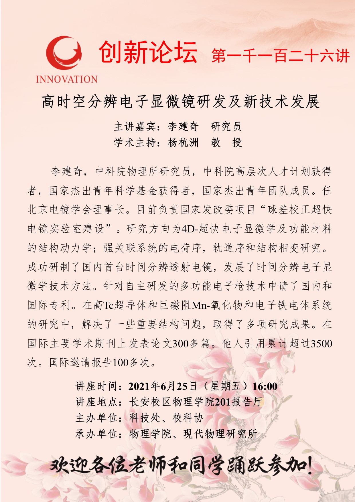 李建奇 研究员 伟德国际1949始于英国创新论坛第一千一百二十六讲:高时空分辨电子显微镜研发及新技术发展 讲座时间 2021年6月25日(星期五)16:00 讲座地点 长安校区物理学院201报告厅 讲座人介绍 李建奇 研究员 讲座内容