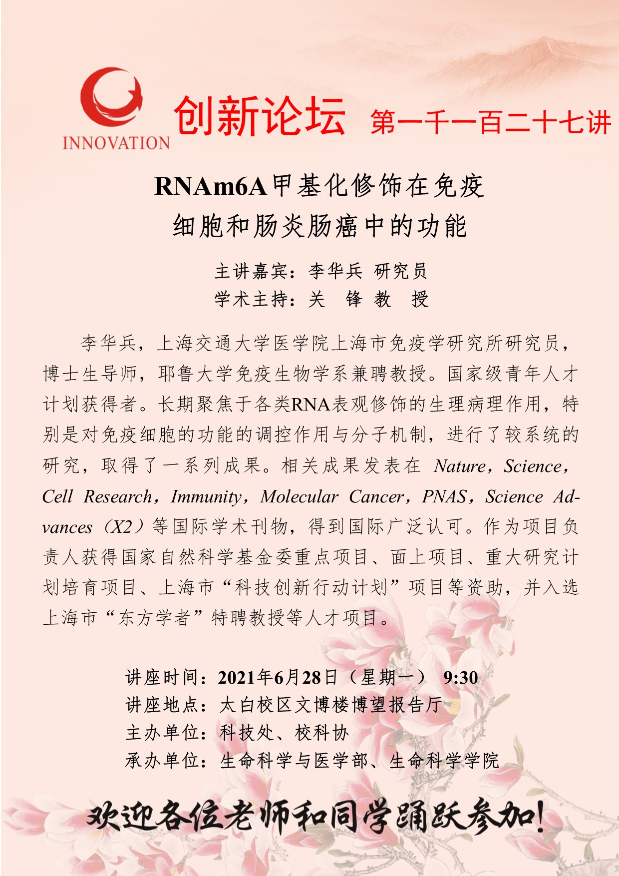 李华兵 研究员 伟德国际1949始于英国创新论坛第一千一百二十七讲:RNAm6A甲基化修饰在免疫细胞和肠炎肠癌中的功能 讲座时间 2021年6月28日(星期一) 9:30 讲座地点 太白校区文博楼博望报告厅 讲座人介绍 李华兵 研究员 讲座内容