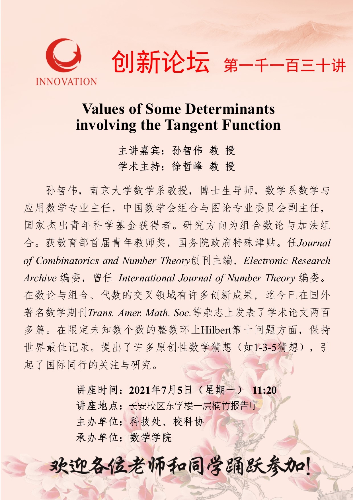 孙智伟 教 授 伟德国际1949始于英国创新论坛第一千一百三十讲:Values of Some Determinants involving the Tangent Function 讲座时间 2021年7月5日(星期一) 11:20 讲座地点 长安校区东学楼一层楠竹报告厅 讲座人介绍 孙智伟 教 授 讲座内容