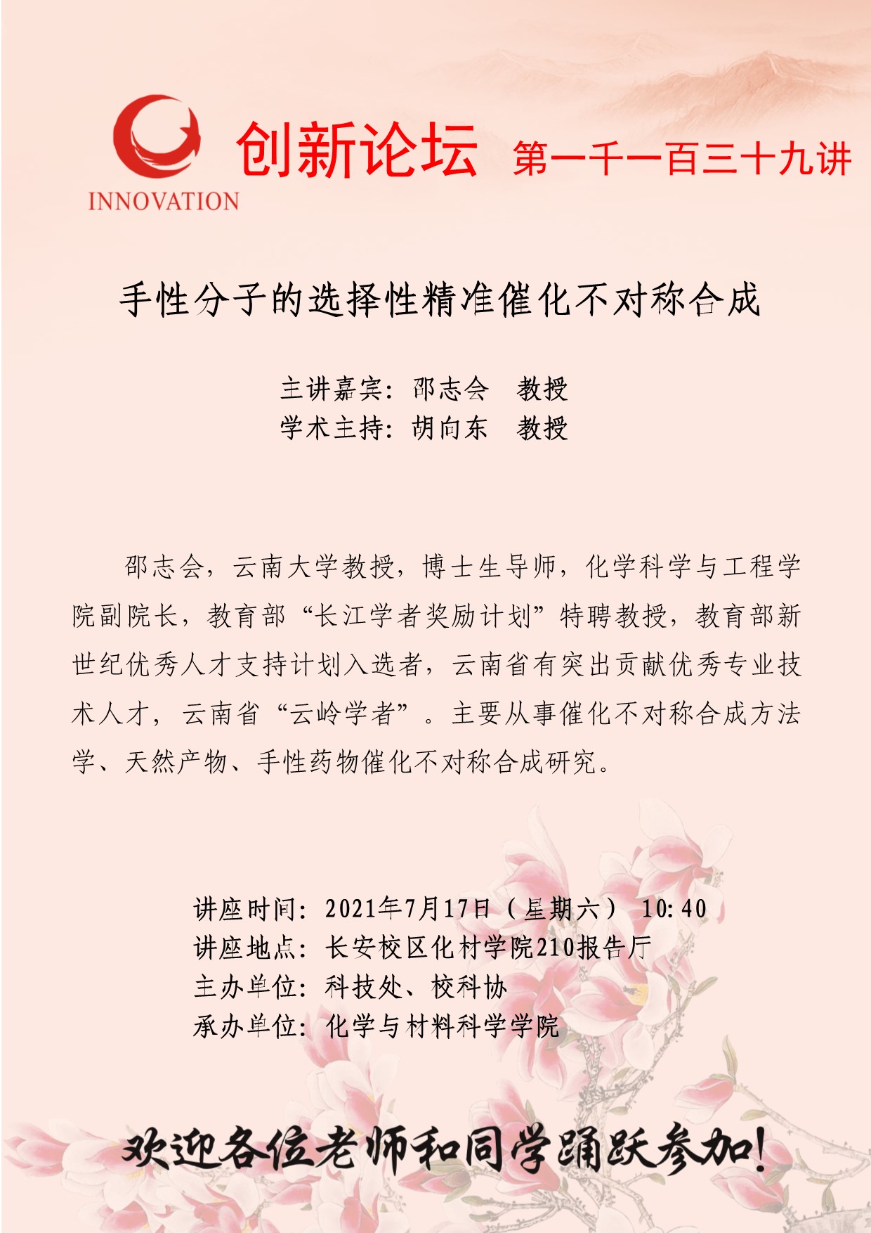 邵志会 教授 伟德国际1949始于英国创新论坛第一千一百三十九讲:手性分子的选择性精准催化不对称合成 讲座时间 2021年7月17日(星期六) 10:40 讲座地点 长安校区化材学院210报告厅 讲座人介绍 邵志会 教授 讲座内容