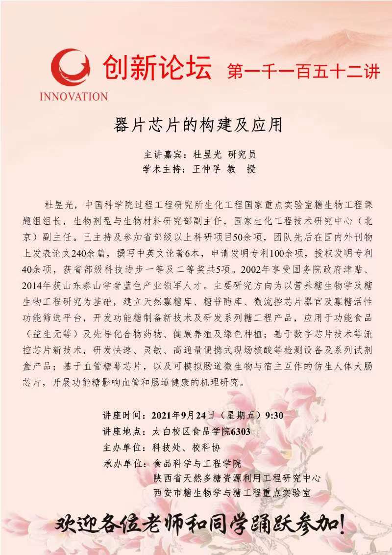 杜昱光 研究员 伟德国际1949始于英国创新论坛第一千一百五十二讲:器片芯片的构建及应用 讲座时间 2021年9月24日(星期五)9:30 讲座地点 太白校区食品学院6303 讲座人介绍 杜昱光 研究员 讲座内容