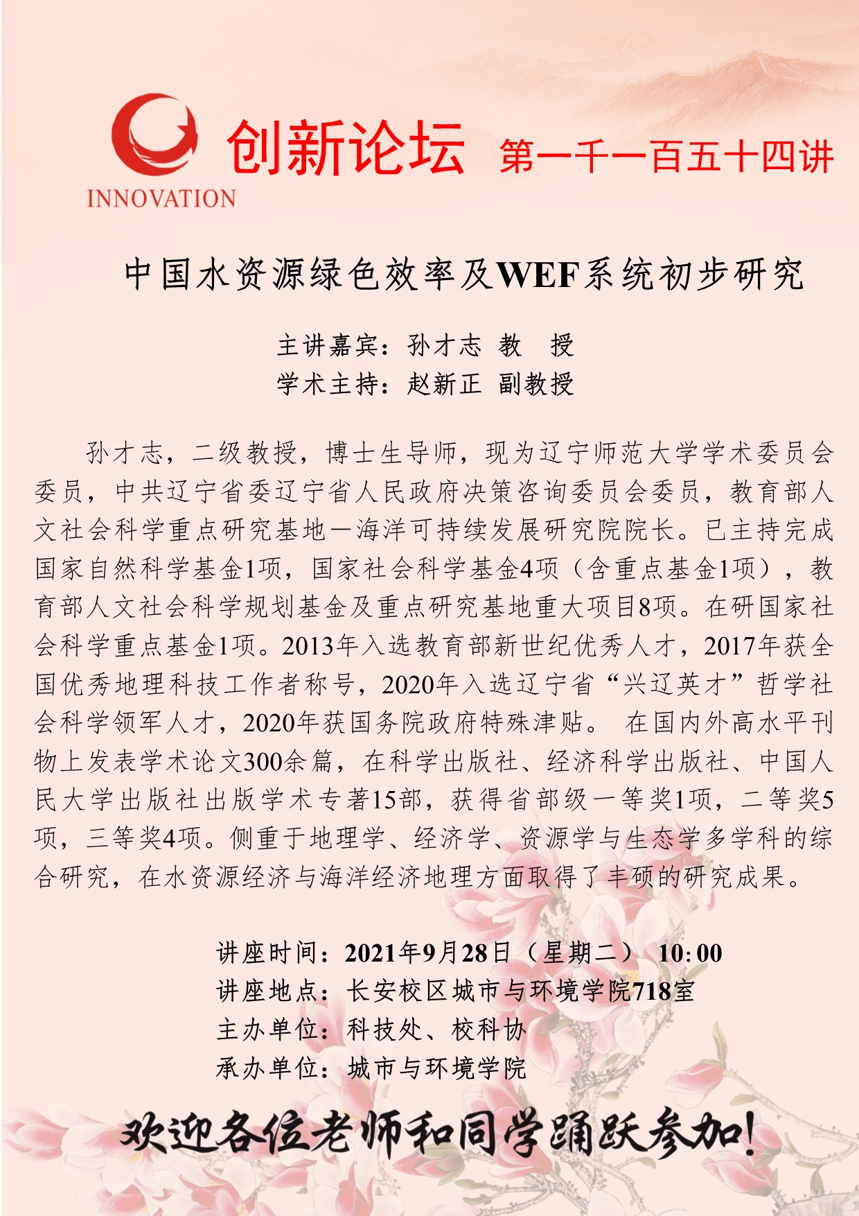 孙才志 教授 伟德国际1949始于英国创新论坛第一千一百五十四讲:中国水资源绿色效率及WEF系统初步研究 讲座时间 2021年9月28日(星期二) 10:00 讲座地点 长安校区城市与环境学院718室 讲座人介绍 孙才志 教授 讲座内容