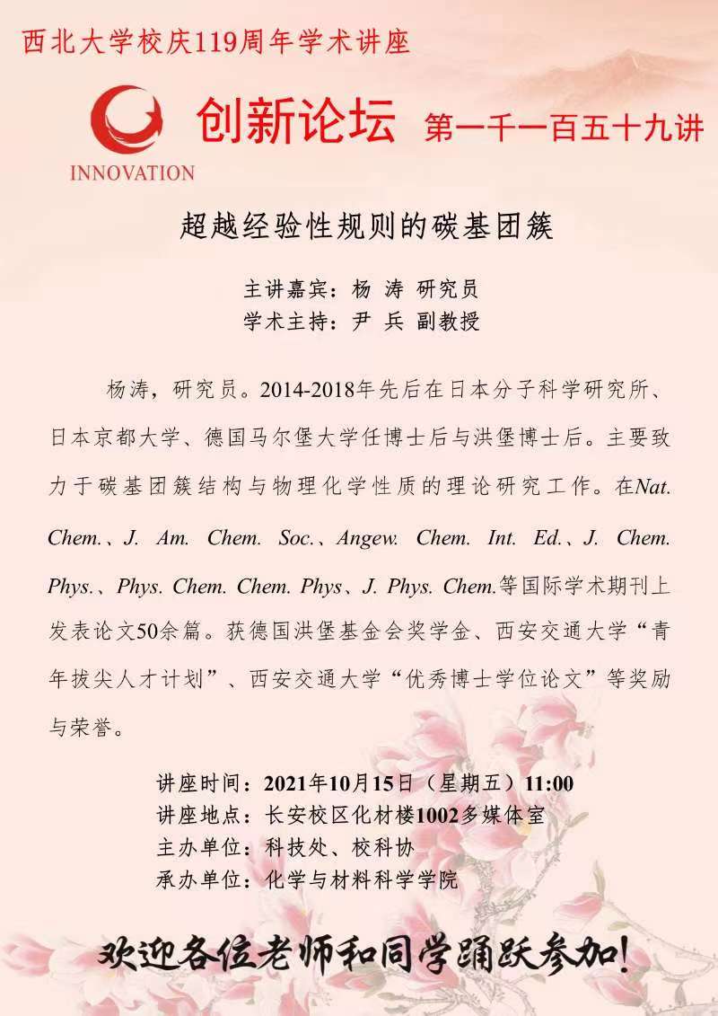 杨涛 研究员 伟德国际1949始于英国创新论坛第一千一百五十九讲暨校庆119周年学术讲座:超越经验性规则的碳基团簇 讲座时间 2021年10月15日(星期五)11:00 讲座地点 长安校区化材楼1002多媒体室 讲座人介绍 杨涛 研究员 讲座内容