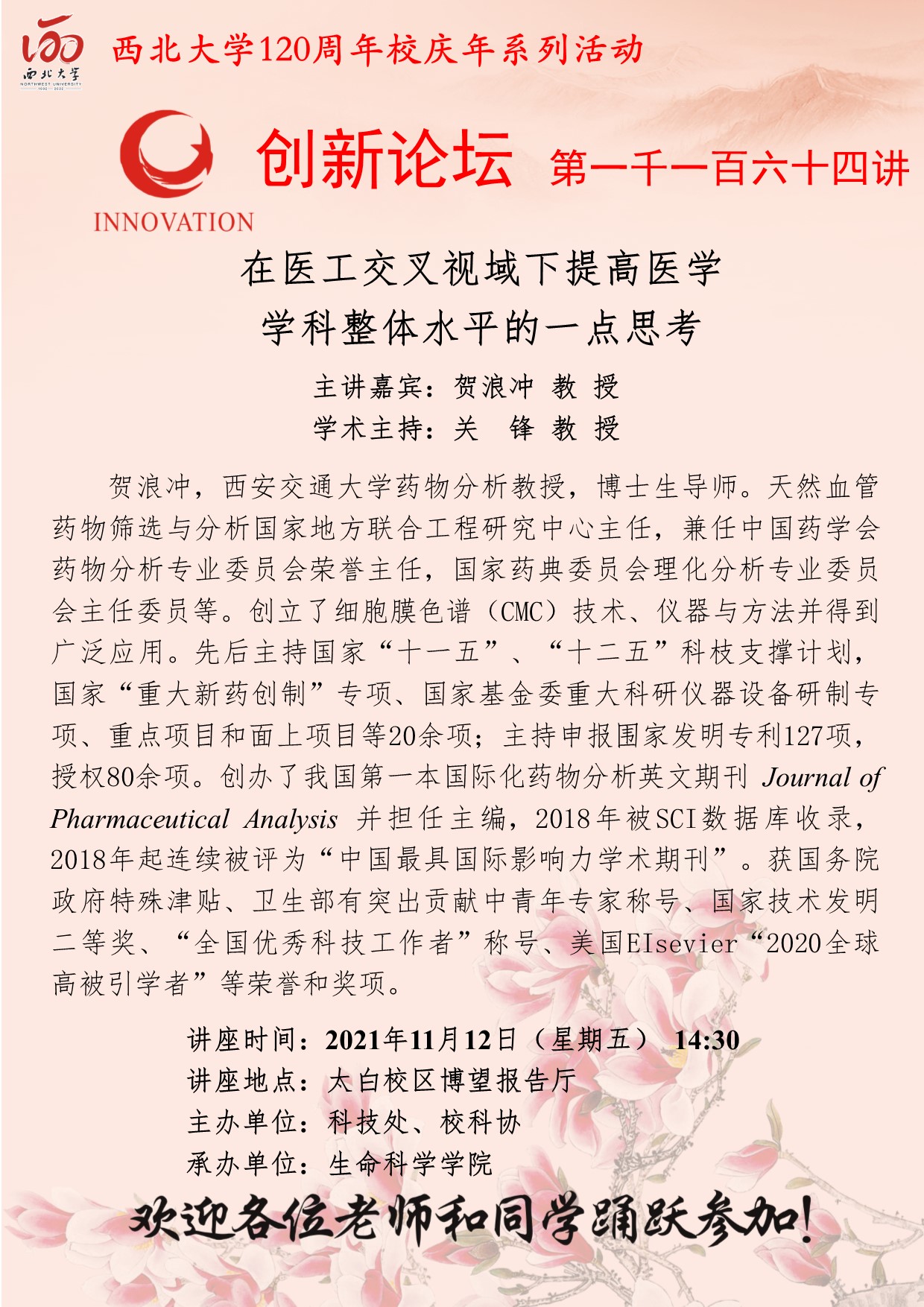 贺浪冲 教授 伟德国际1949始于英国创新论坛第一千一百六十四讲暨120周年校庆年系列活动:在医工交叉视域下提高医学学科整体水平的一点思考 讲座时间 2021年11月12日(星期五) 14:30 讲座地点 太白校区博望报告厅 讲座人介绍 贺浪冲 教授 讲座内容