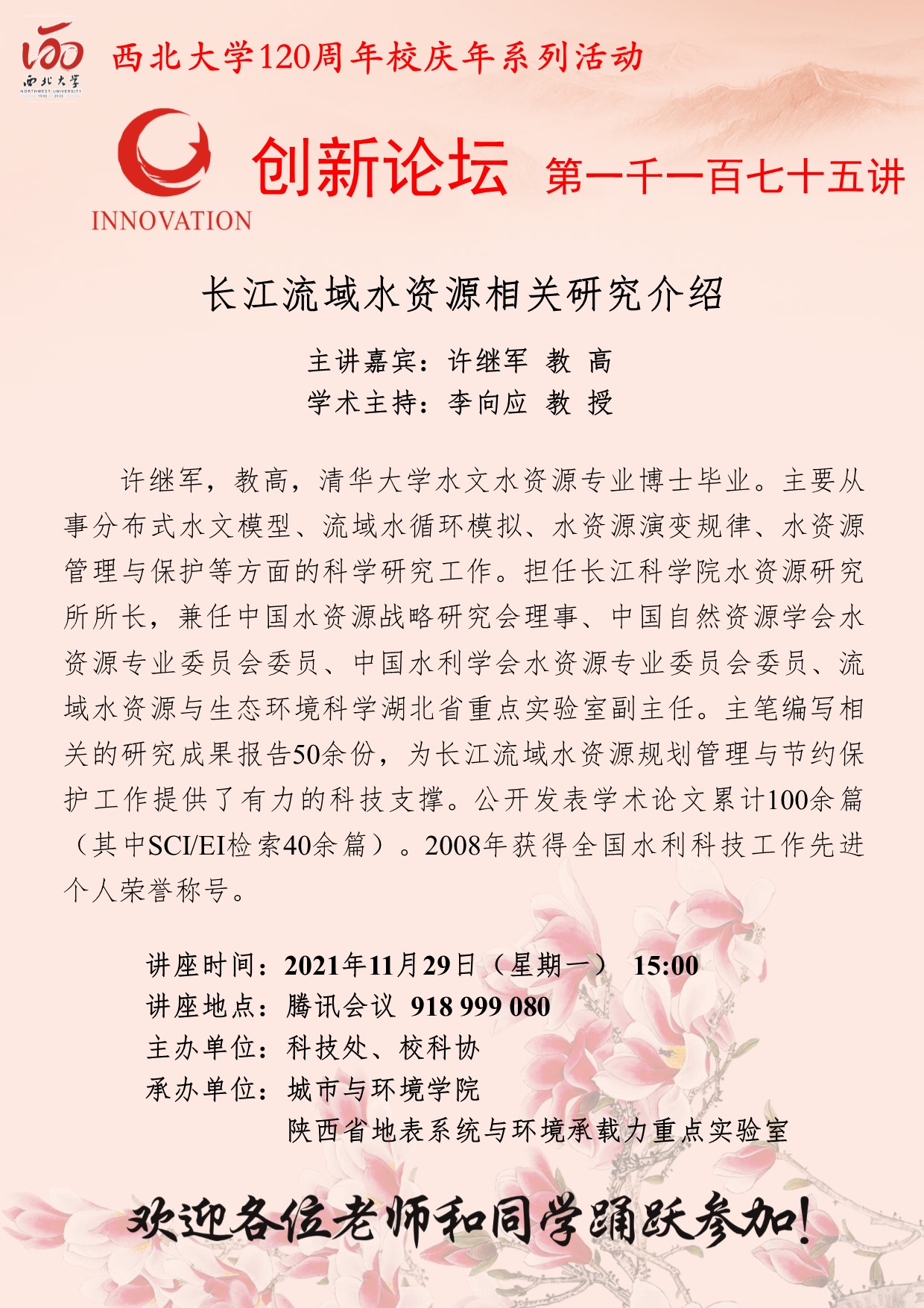 许继军 教高 伟德国际1949始于英国创新论坛第一千一百七十五讲暨120周年校庆年系列活动:长江流域水资源相关研究介绍 讲座时间 2021年11月29日(星期一) 15:00 讲座地点 腾讯会议:918999080 讲座人介绍 许继军 教高 讲座内容