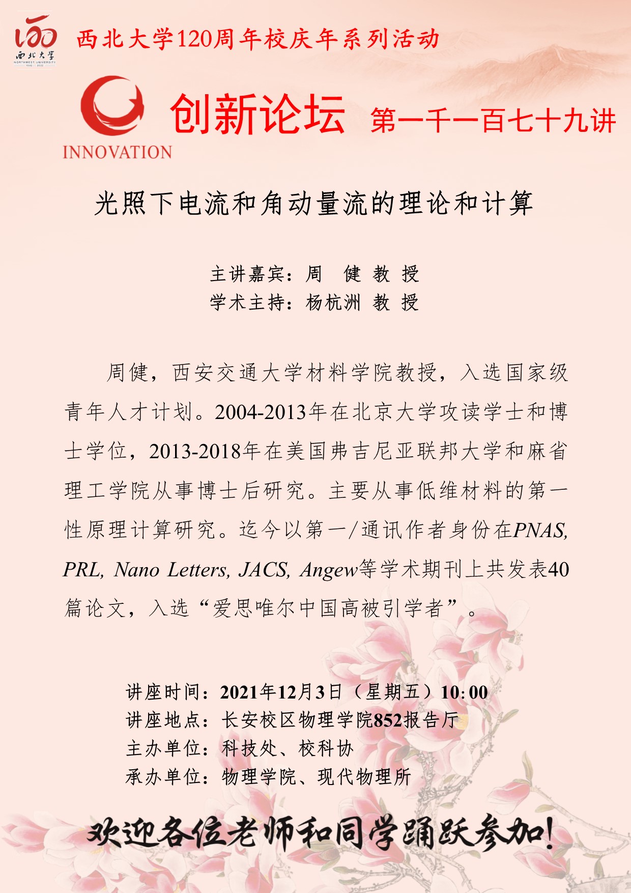 周健 教授 伟德国际1949始于英国创新论坛第一千一百七十九讲暨120周年校庆年系列活动:光照下电流和角动量流的理论和计算 讲座时间 2021年12月3日(星期五)10:00 讲座地点 长安校区物理学院852报告厅 讲座人介绍 周健 教授 讲座内容