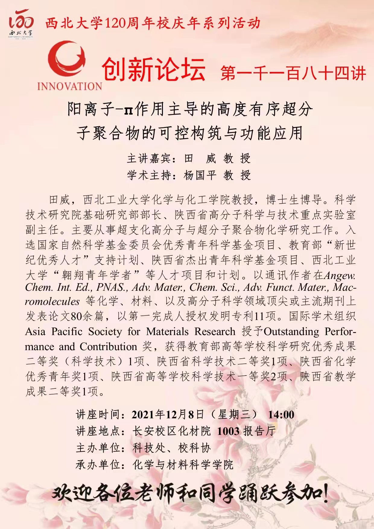 田威 教授 伟德国际1949始于英国创新论坛第一千一百八十四讲暨120周年校庆年系列活动:阳离子-π作用主导的高度有序超分子聚合物的可控构筑与功能应用 讲座时间 2021年12月8日(星期三) 14:00 讲座地点 长安校区化材院 1003 报告厅 讲座人介绍 田威 教授 讲座内容