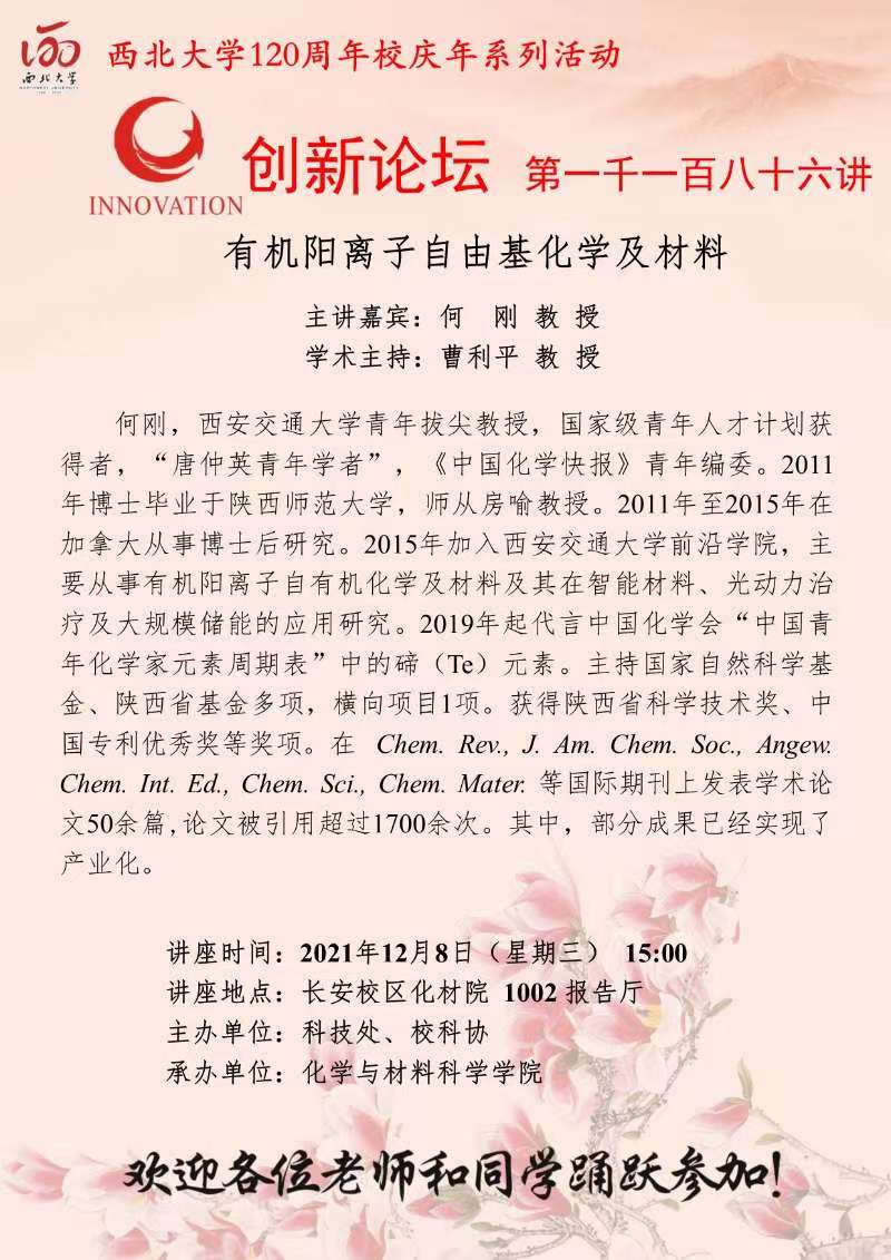 何刚 教授 伟德国际1949始于英国创新论坛第一千一百八十六讲暨120周年校庆年系列活动:有机阳离子自由基化学及材料 讲座时间 2021年12月8日(星期三) 15:00 讲座地点 长安校区化材院1002报告厅 讲座人介绍 何刚 教授 讲座内容