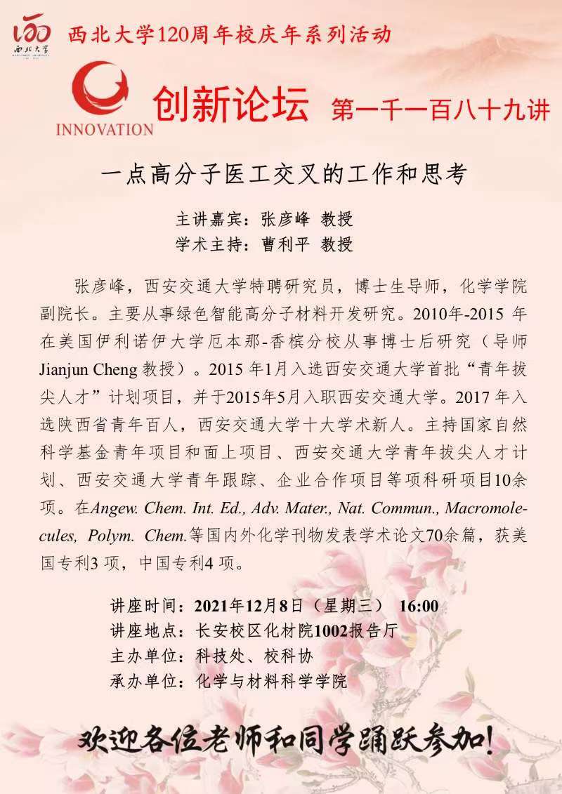 张彦峰 教授 伟德国际1949始于英国创新论坛第一千一百八十九讲暨120周年校庆年系列活动:一点高分子医工交叉的工作和思考 讲座时间 2021年12月8日(星期三) 16:00 讲座地点 长安校区化材院1002报告厅 讲座人介绍 张彦峰 教授 讲座内容