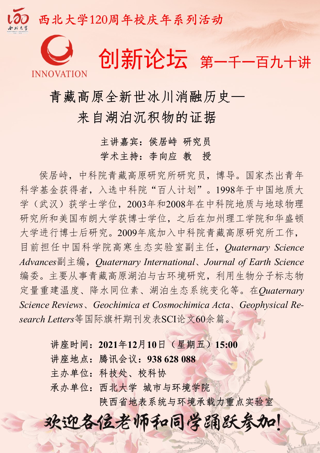 侯居峙 研究员 伟德国际1949始于英国创新论坛第一千一百九十讲暨120周年校庆年系列活动:青藏高原全新世冰川消融历史—来自湖泊沉积物的证据 讲座时间 2021年12月10日(星期五)15:00 讲座地点 腾讯会议:938628088 讲座人介绍 侯居峙 研究员 讲座内容
