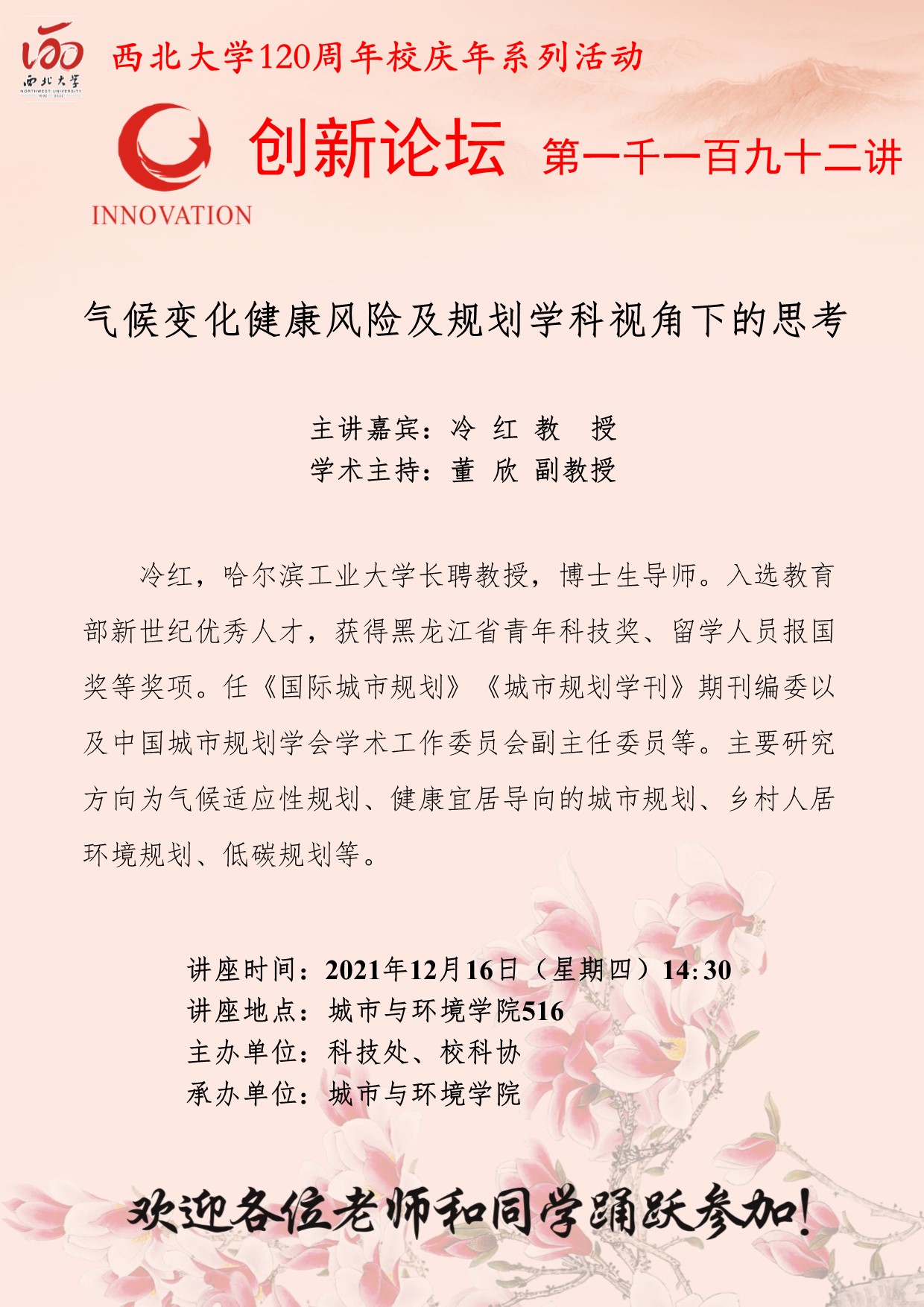 冷红 教授 伟德国际1949始于英国创新论坛第一千一百九十二讲暨120周年校庆年系列活动:气候变化健康风险及规划学科视角下的思考 讲座时间 2021年12月16日(星期四)14:30 讲座地点 城市与环境学院516 讲座人介绍 冷红 教授 讲座内容