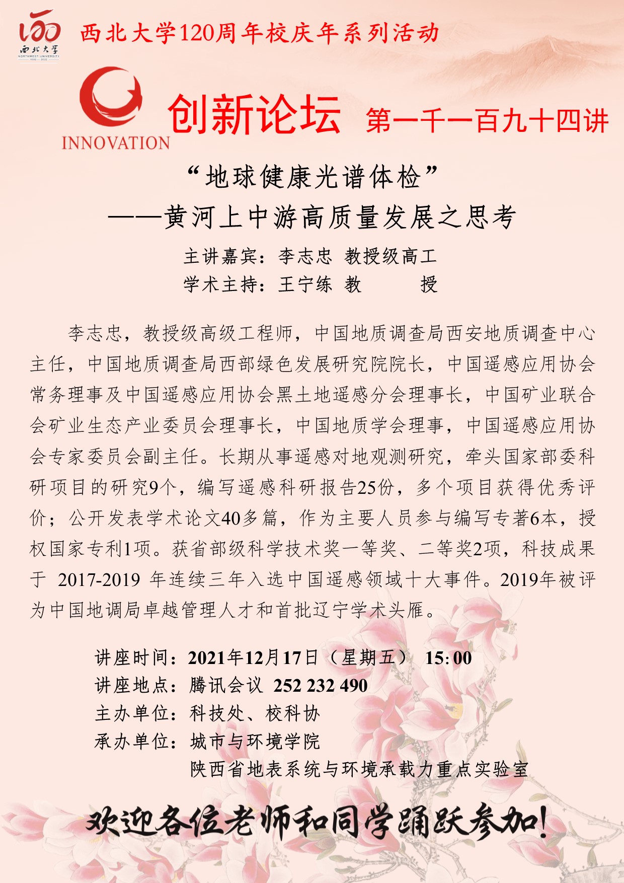 李志忠 教授级高工 伟德国际1949始于英国创新论坛第一千一百九十四讲暨120周年校庆年系列活动:“地球健康光谱体检”——黄河上中游高质量发展之思考 讲座时间 2021年12月17日(星期五) 15:00 讲座地点 腾讯会议 252232490 讲座人介绍 李志忠 教授级高工 讲座内容