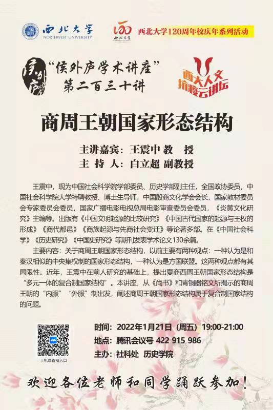王震中 教授 侯外庐学术讲座第二百三十讲暨伟德人文抗疫云讲坛:商周王朝国家形态结构 讲座时间 2022年1月21日(周五)19:00-21:00 讲座地点 腾讯会议:422915986 讲座人介绍 王震中 教授 讲座内容