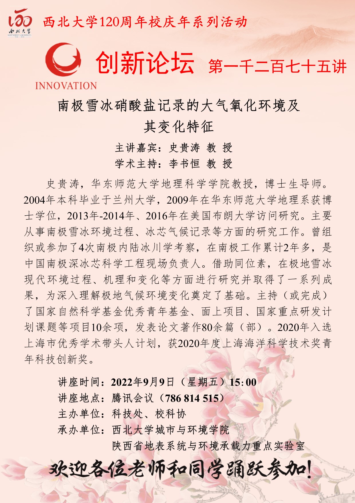 史贵涛 教 授 伟德国际1949始于英国创新论坛第一千二百七十五讲暨120周年校庆年系列活动:南极雪冰硝酸盐记录的大气氧化环境及其变化特征 讲座时间 2022年9月9日(星期五)15:00 讲座地点 讲座地点:腾讯会议(786 814 515) 讲座人介绍 史贵涛 教 授 讲座内容