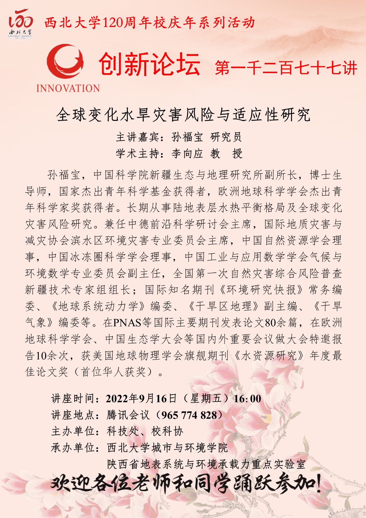 孙福宝 研究员 伟德国际1949始于英国创新论坛第一千二百七十七讲暨120周年校庆年系列活动:全球变化水旱灾害风险与适应性研究 讲座时间 2022年9月16日(星期五)16:00 讲座地点 腾讯会议(965 774 828) 讲座人介绍 孙福宝 研究员 讲座内容