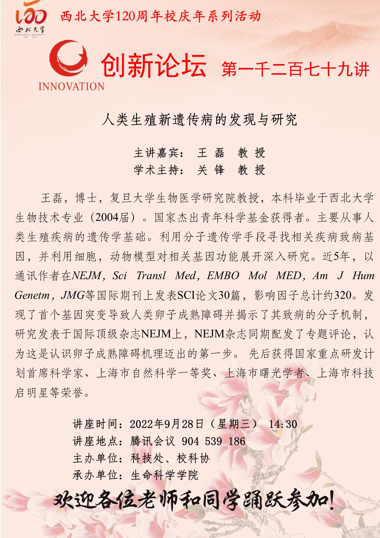 王 磊 教 授 伟德国际1949始于英国创新论坛第一千二百七十九讲暨120周年校庆年系列活动:人类生殖新遗传病的发现与研究 讲座时间 2022年9月28日(星期三) 14:30 讲座地点 腾讯会议 904 539 186 讲座人介绍 王 磊 教 授 讲座内容