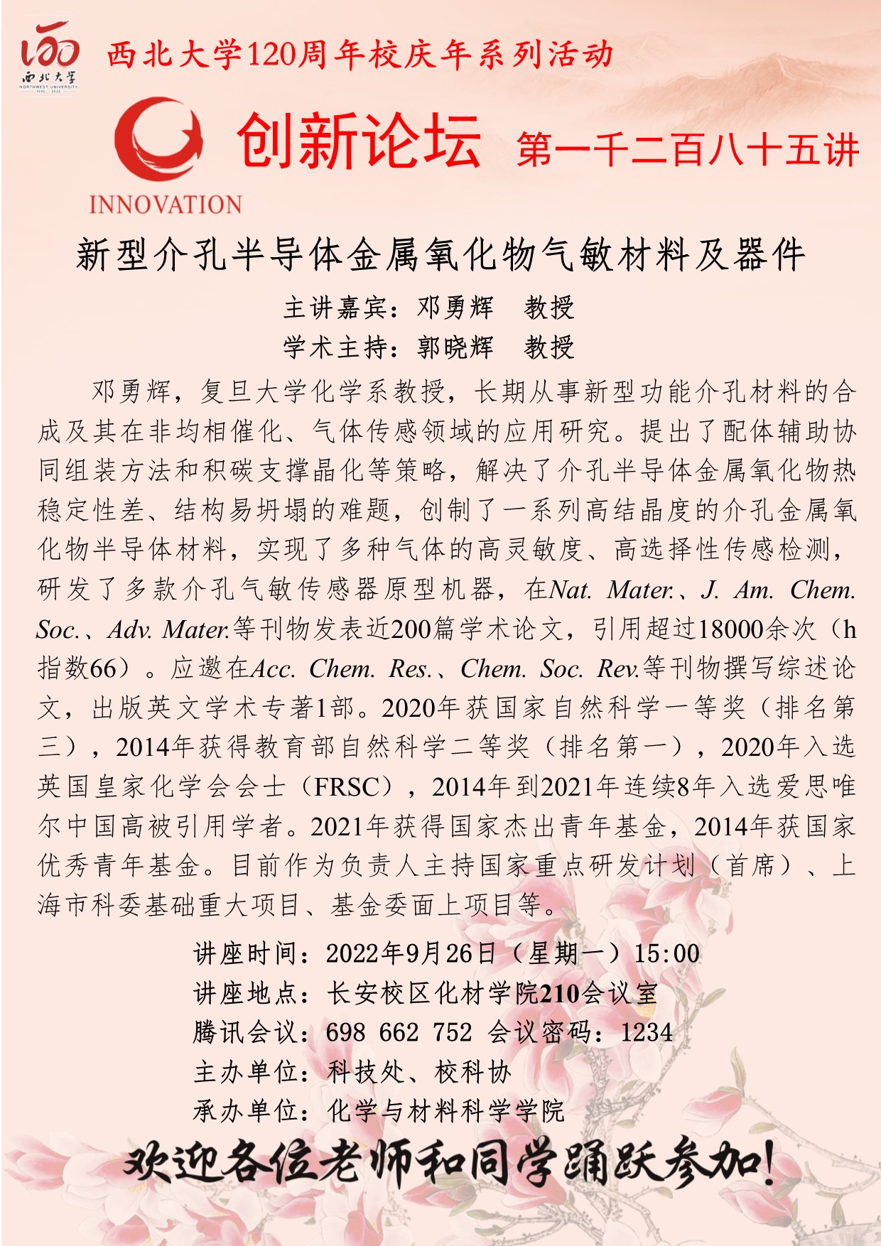 邓勇辉 教授 伟德国际1949始于英国创新论坛第一千二百八十五讲暨120周年校庆年系列活动::新型介孔半导体金属氧化物气敏材料及器件 讲座时间 2022年9月26日(星期一) 15:00 讲座地点 长安校区化材院210会议室(腾讯会议:698 662 752,会议密码:1234) 讲座人介绍 邓勇辉 教授 讲座内容