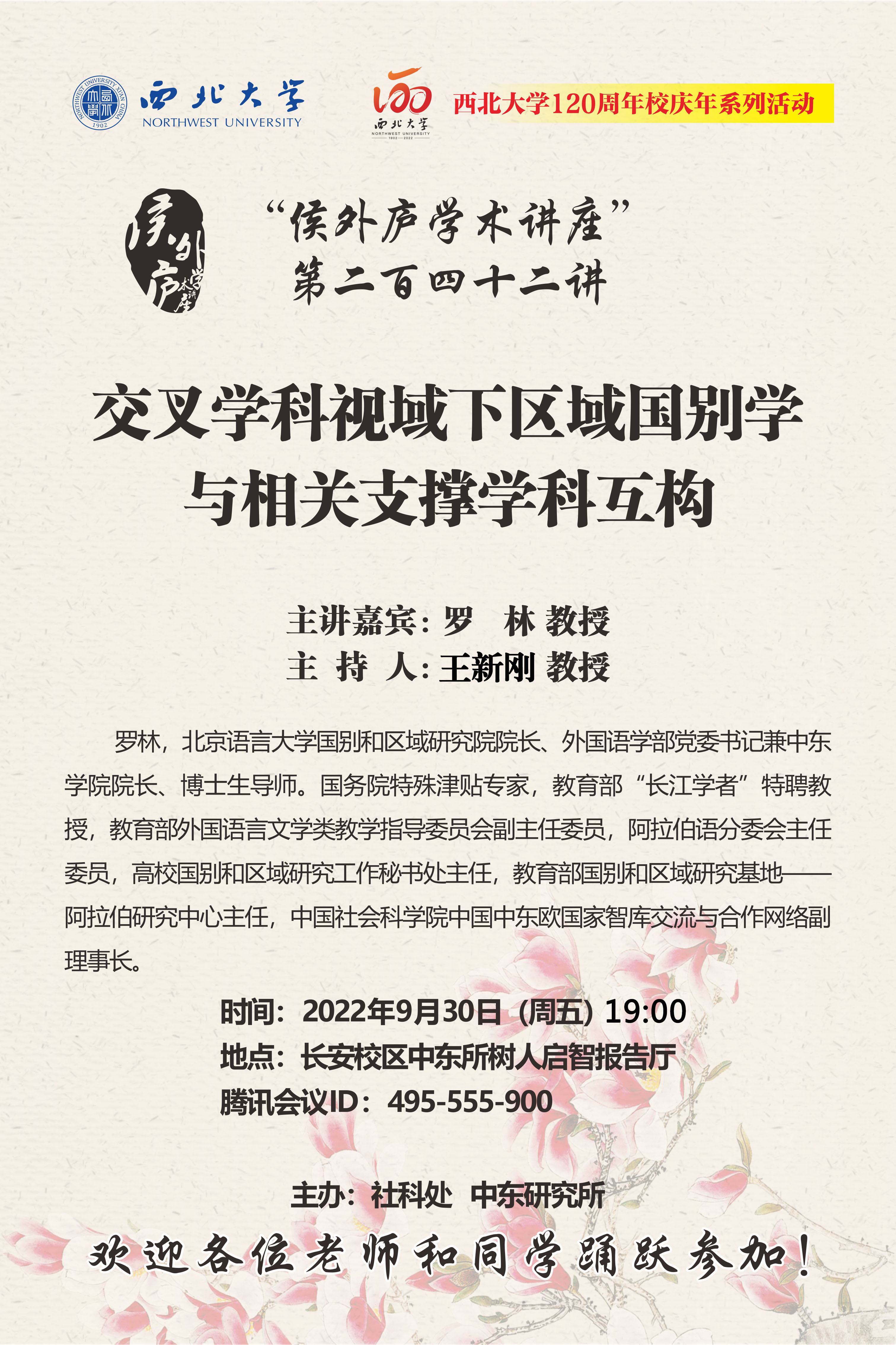 罗林 教授 侯外庐学术讲座第二百四十二讲暨120周年校庆年系列活动:交叉学科视域下区域国别学与相关支撑学科互构 讲座时间 2022年9月30日(周五)19:00 讲座地点 腾讯会议ID:495-555-900 线下地点:长安校区中东所树人启智报告厅 讲座人介绍 罗林 教授 讲座内容