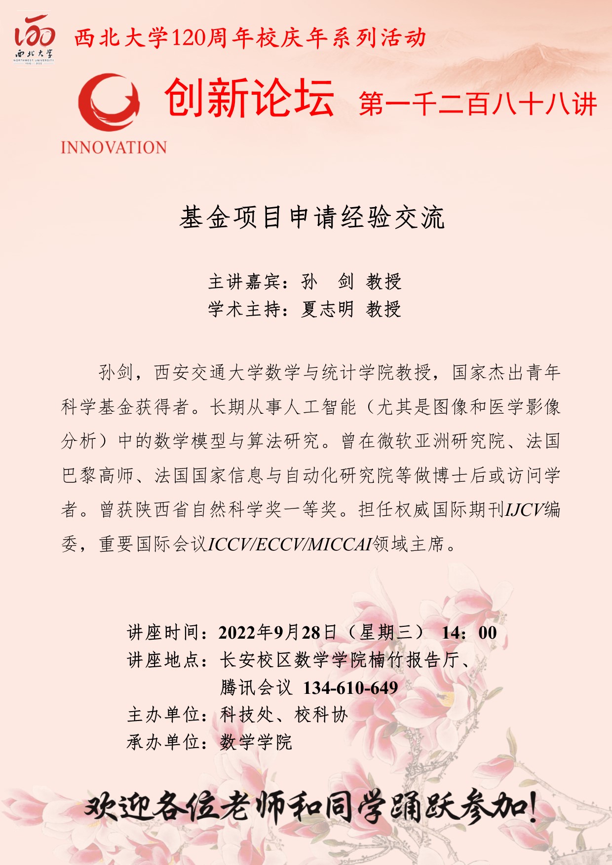 孙 剑 教授 伟德国际1949始于英国创新论坛第一千二百八十八讲暨120周年校庆年系列活动:基金项目申请经验交流 讲座时间 2022年9月28日(星期三) 14:00 讲座地点 长安校区数学学院楠竹报告厅、腾讯会议 134-610-649 讲座人介绍 孙 剑 教授 讲座内容