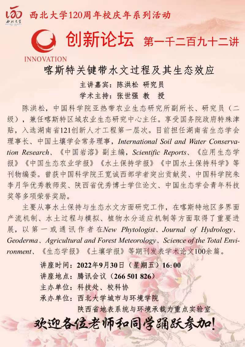 陈洪松 教授 伟德国际1949始于英国创新论坛第一千二百九十二讲暨120周年校庆年系列活动: 喀斯特关键带水文过程及其生态效应 讲座时间 2022年9月30日(星期五) 16:00 讲座地点 腾讯会议 266 501 826 讲座人介绍 陈洪松 教授 讲座内容