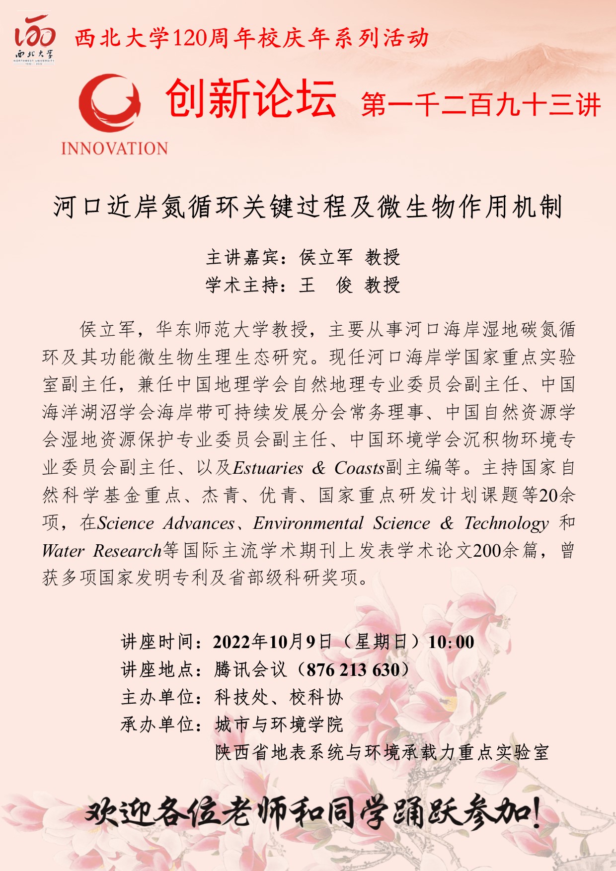 侯立军 教授 伟德国际1949始于英国创新论坛第一千二百九十三讲暨120周年校庆年系列活动: 河口近岸氮循环关键过程及微生物作用机制 讲座时间 2022年10月9日(星期日)10:00 讲座地点 腾讯会议(876 213 630) 讲座人介绍 侯立军 教授 讲座内容