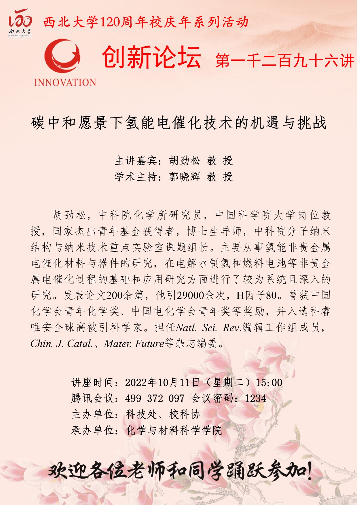 胡劲松 教授 伟德国际1949始于英国创新论坛第一千二百九十六讲暨120周年校庆年系列活动: 碳中和愿景下氢能电催化技术的机遇与挑战 讲座时间 2022年10月11日(星期二)15:00 讲座地点 腾讯会议 499 372 097 会议密码 1234 讲座人介绍 胡劲松 教授 讲座内容