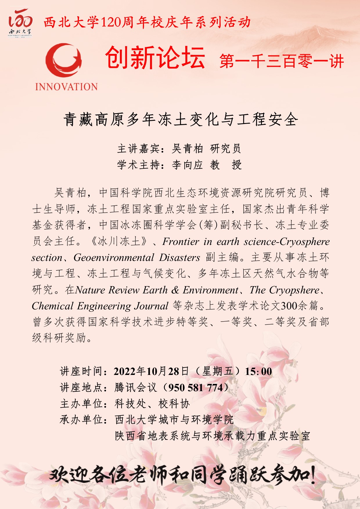 吴青柏 研究员 伟德国际1949始于英国创新论坛第一千三百零一讲暨120周年校庆年系列活动: 青藏高原多年冻土变化与工程安全 讲座时间 2022年10月28日(星期五)15:00 讲座地点 腾讯会议 950 581 774 讲座人介绍 吴青柏 研究员 讲座内容