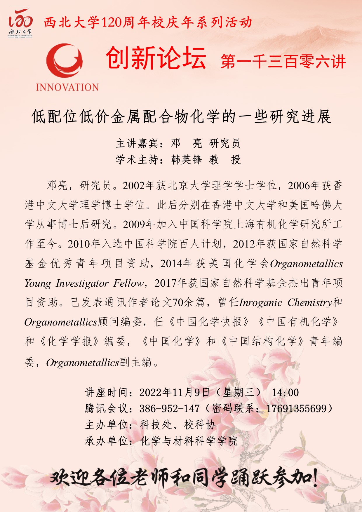 邓亮 研究员 伟德国际1949始于英国创新论坛第一千三百零六讲暨120周年校庆年系列活动: 低配位低价金属配合物化学的一些研究进展 讲座时间 2022年11月9日(星期三) 14:00 讲座地点 腾讯会议 386-952-147 讲座人介绍 邓亮 研究员 讲座内容
