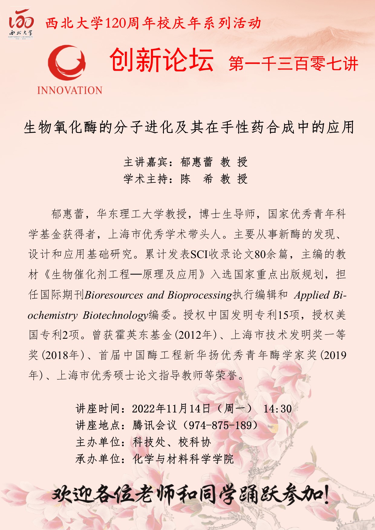 郁惠蕾 教授 伟德国际1949始于英国创新论坛第一千三百零七讲暨120周年校庆年系列活动: 生物氧化酶的分子进化及其在手性药合成中的应用 讲座时间 2022年11月14日(星期一)14:30 讲座地点 腾讯会议(974 875 189) 讲座人介绍 郁惠蕾 教授 讲座内容