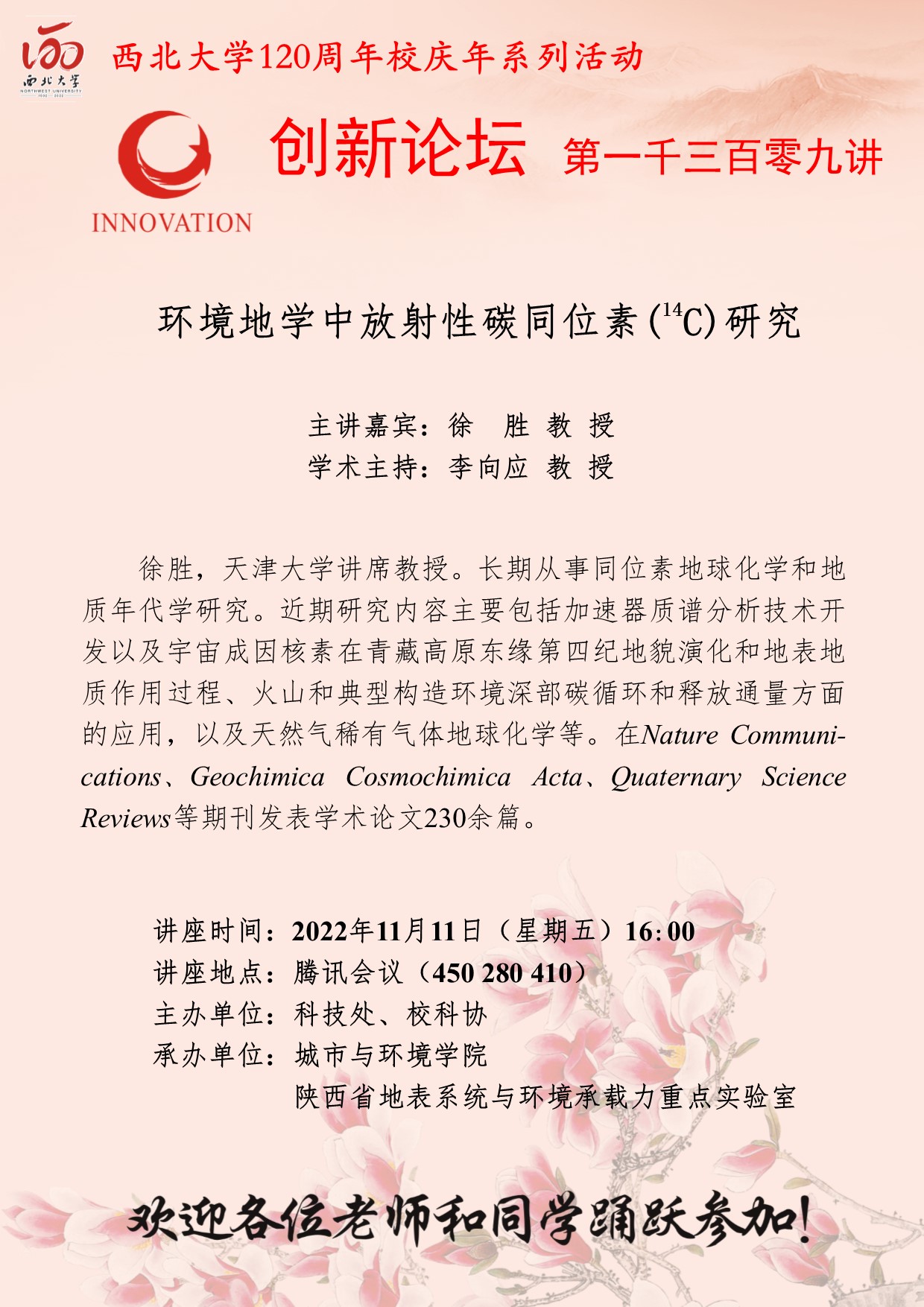 徐胜 教授 伟德国际1949始于英国创新论坛第一千三百零九讲暨120周年校庆年系列活动: 环境地学中放射性碳同位素(14C)研究 讲座时间 2022年11月11日(星期五)16:00 讲座地点 腾讯会议(450 280 410) 讲座人介绍 徐胜 教授 讲座内容