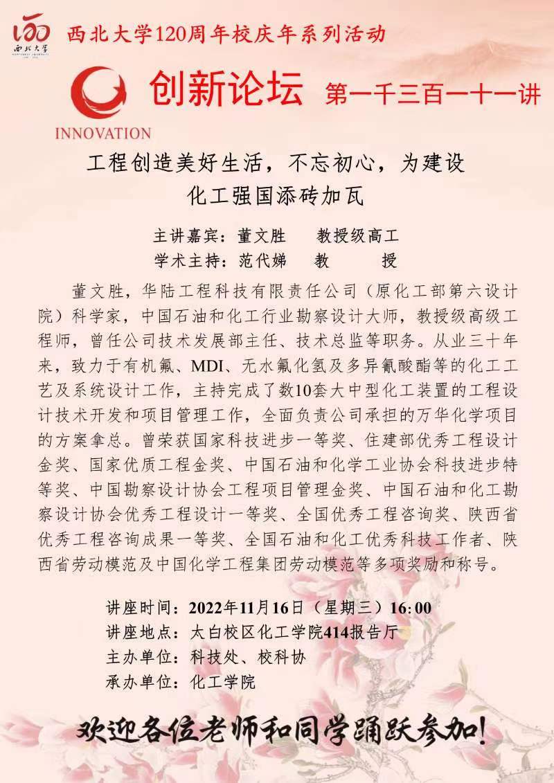 董文胜 教授级高工 伟德国际1949始于英国创新论坛第一千三百一十一讲暨120周年校庆年系列活动: 工程创造美好生活,不忘初心,为建设化工强国添砖加瓦 讲座时间 2022年11月16日(星期三)16:00 讲座地点 太白校区化工学院414报告厅 讲座人介绍 董文胜 教授级高工 讲座内容