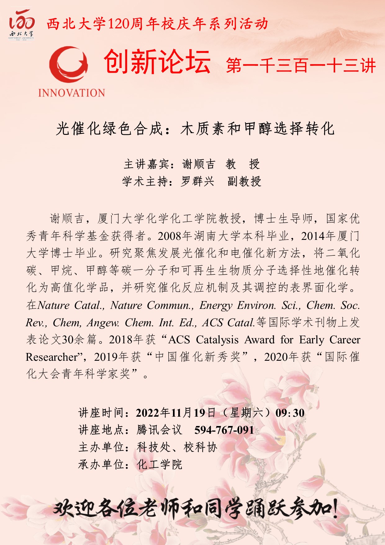 谢顺吉 教授 伟德国际1949始于英国创新论坛第一千三百一十三讲暨120周年校庆年系列活动: 光催化绿色合成:木质素和甲醇选择转化 讲座时间 2022年11月19日(星期六)09:30 讲座地点 腾讯会议( 594-767-091) 讲座人介绍 谢顺吉 教授 讲座内容