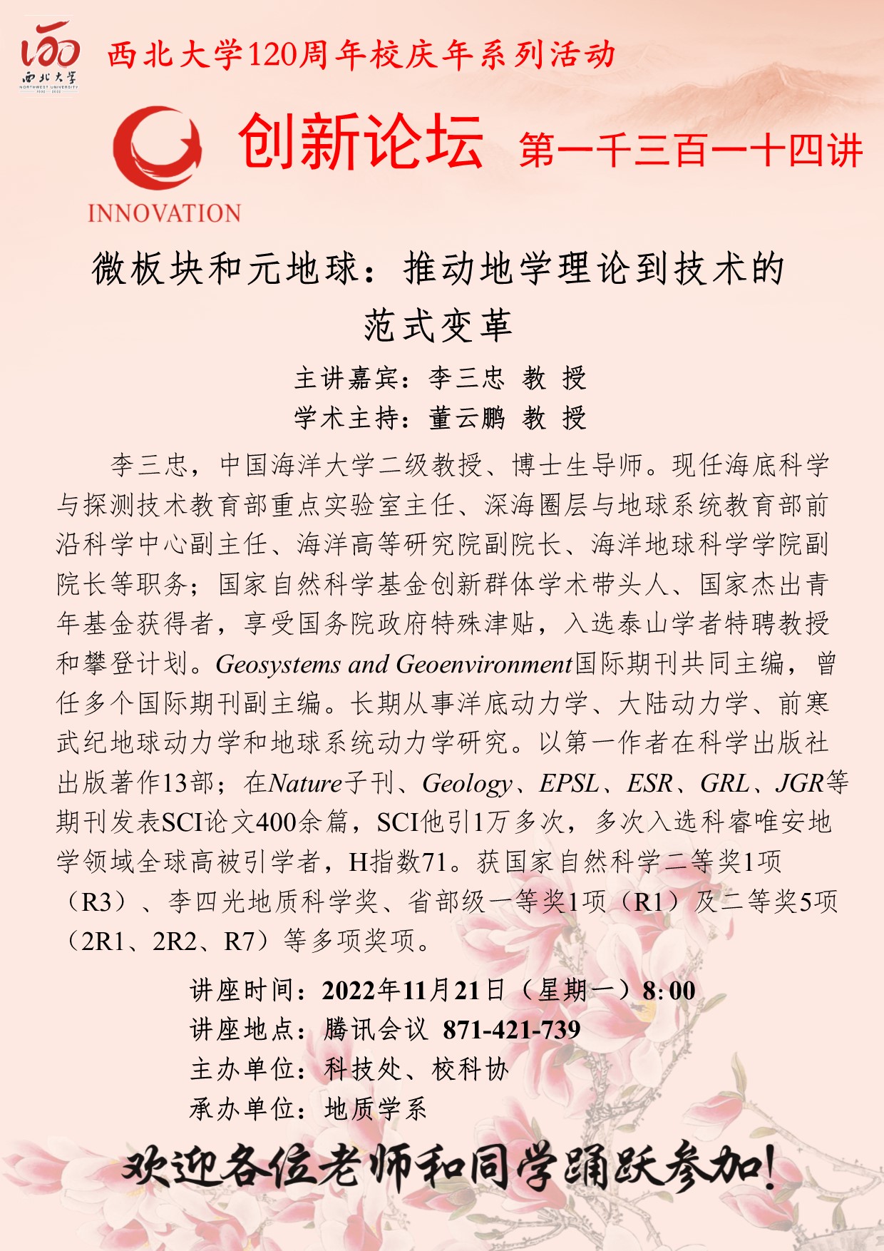 李三忠 教授 伟德国际1949始于英国创新论坛第一千三百一十四讲暨120周年校庆年系列活动: 微板块和元地球:推动地学理论到技术的范式变革 讲座时间 2022年11月21日(星期一)8:00 讲座地点 腾讯会议(871-421-739) 讲座人介绍 李三忠 教授 讲座内容