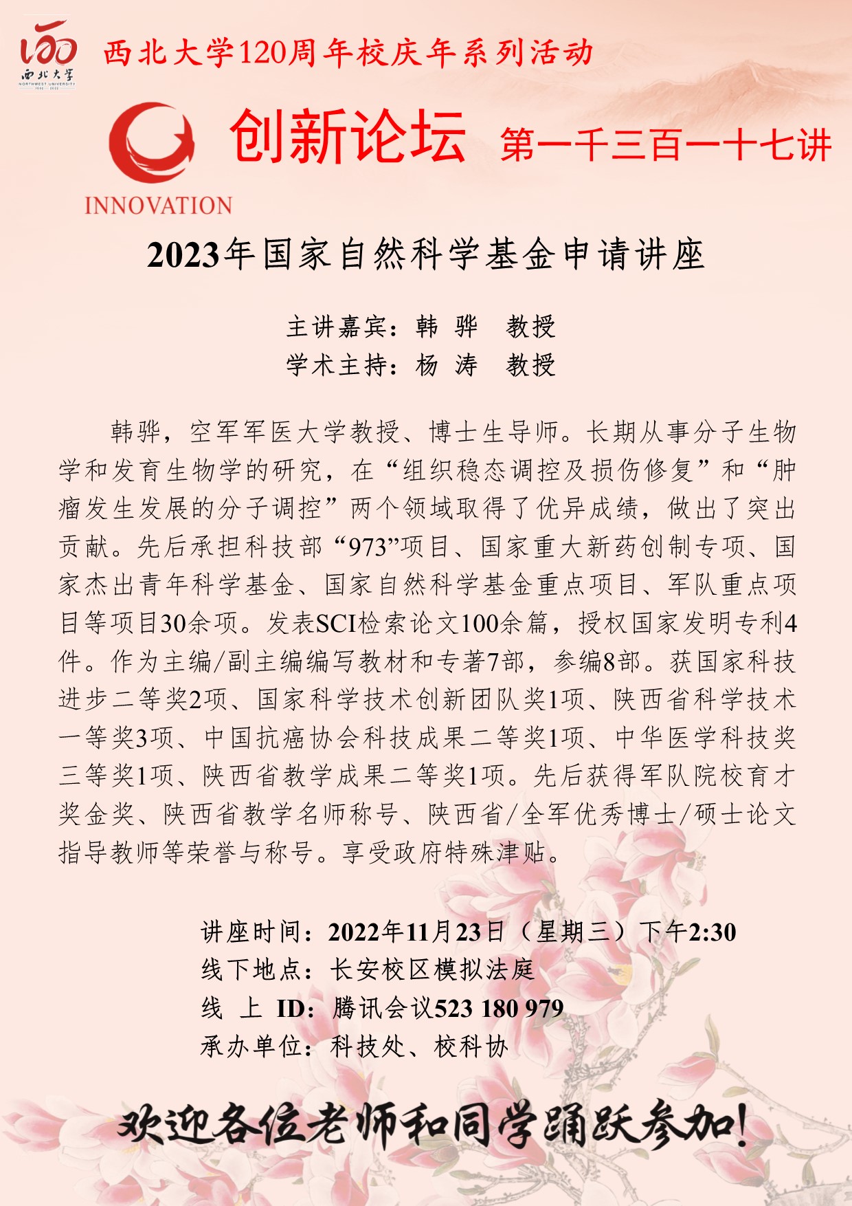 韩骅 教授 伟德国际1949始于英国创新论坛第一千三百一十七讲暨120周年校庆年系列活动:2023年国家自然科学基金申请讲座 讲座时间 2022年11月23日(星期三)下午2:30 讲座地点 长安校区模拟法庭 讲座人介绍 韩骅 教授 讲座内容
