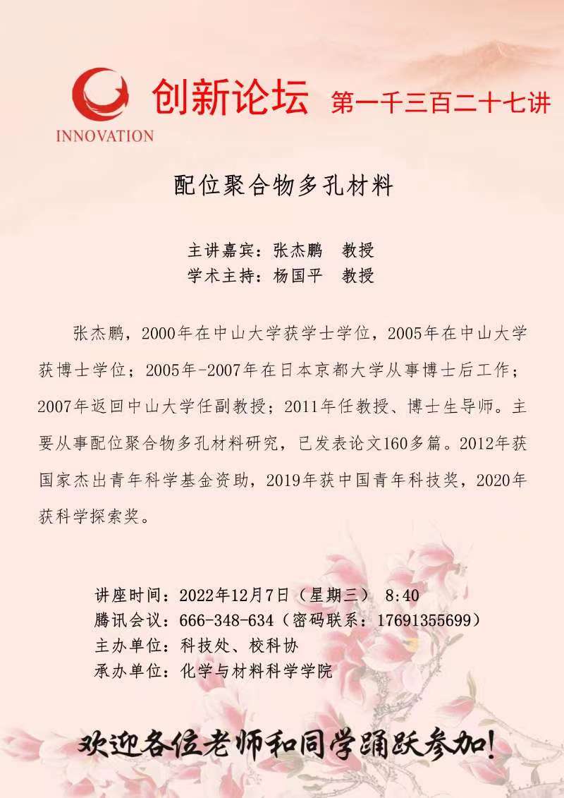 张杰鹏 教授 伟德国际1949始于英国创新论坛第一千三百二十七讲:配位聚合物多孔材料 讲座时间 2022年12月7日(星期三) 8:40 讲座地点 腾讯会议:666-348-634 讲座人介绍 张杰鹏 教授 讲座内容