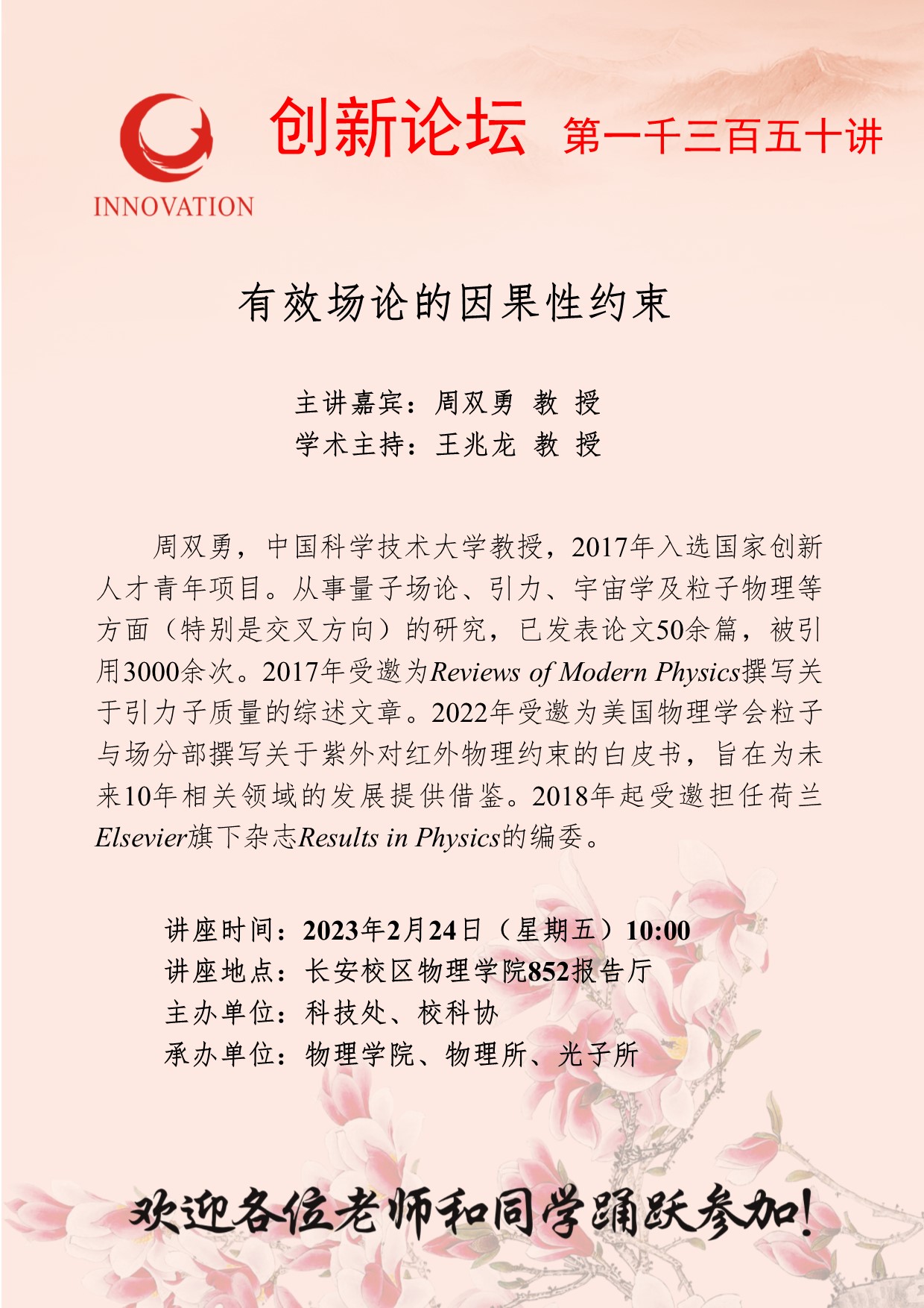 周双勇 教授 伟德国际1949始于英国创新论坛第一千三百五十讲: 有效场论的因果性约束 讲座时间 2023年2月24日(星期五)10:00 讲座地点 长安校区物理学院852报告厅 讲座人介绍 周双勇 教授 讲座内容