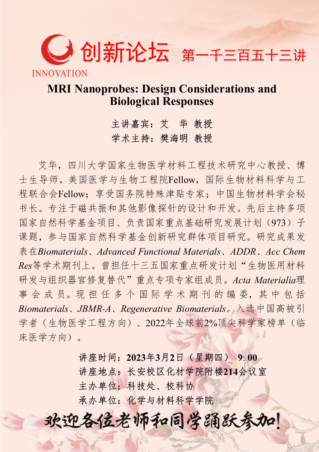 艾华 教授 伟德国际1949始于英国创新论坛第一千三百五十三讲:MRI Nanoprobes: Design Considerations and Biological Responses 讲座时间 2023年3月2日(星期四) 9: 00 讲座地点 长安校区化材学院附楼214会议室 讲座人介绍 艾华 教授 讲座内容