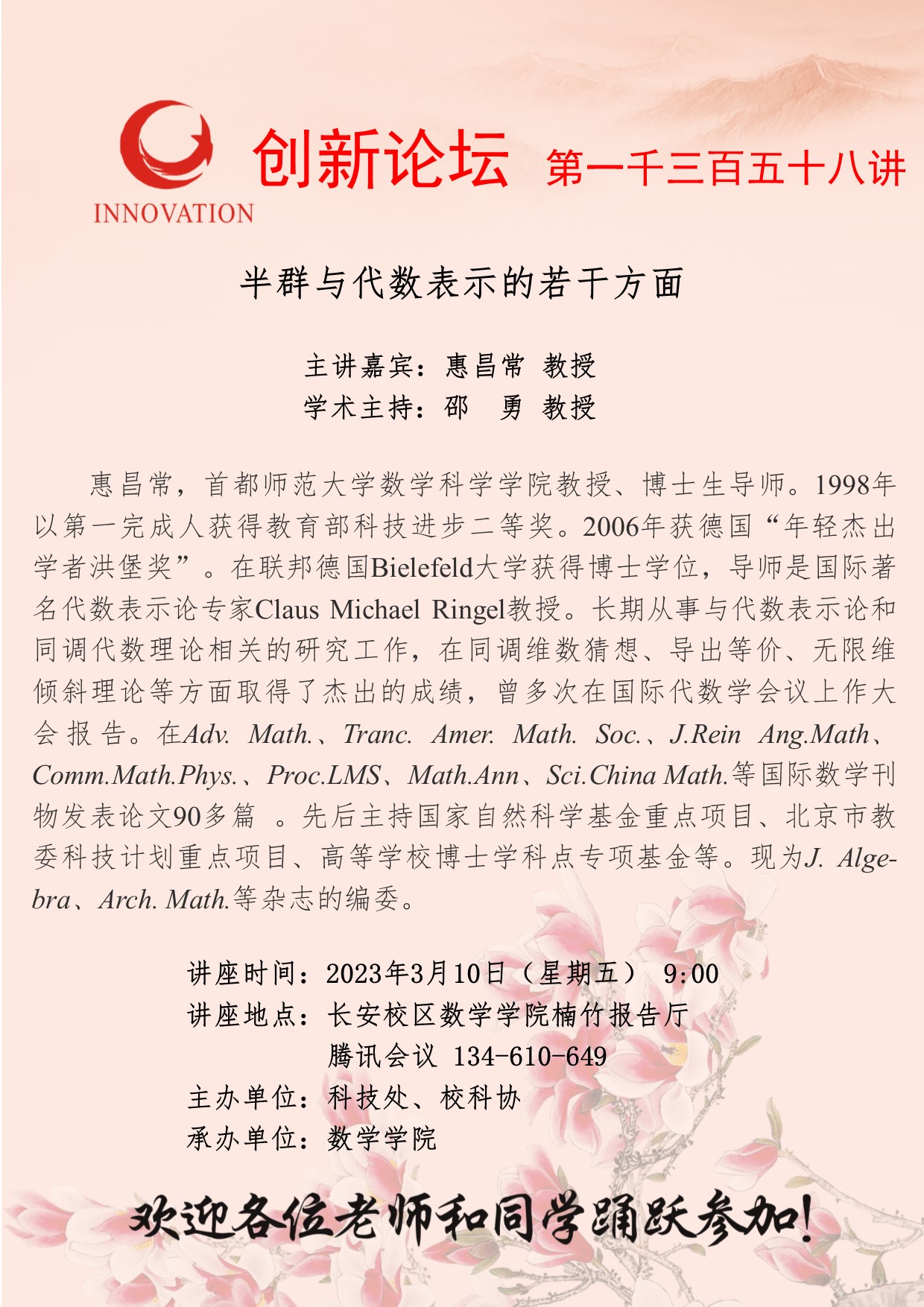 惠昌常 教授 伟德国际1949始于英国创新论坛第一千三百五十八讲:半群与代数表示的若干方面 讲座时间 2023年3月10日(星期五) 9:00 讲座地点 长安校区数学学院楠竹报告厅、腾讯会议134-610-649 讲座人介绍 惠昌常 教授 讲座内容