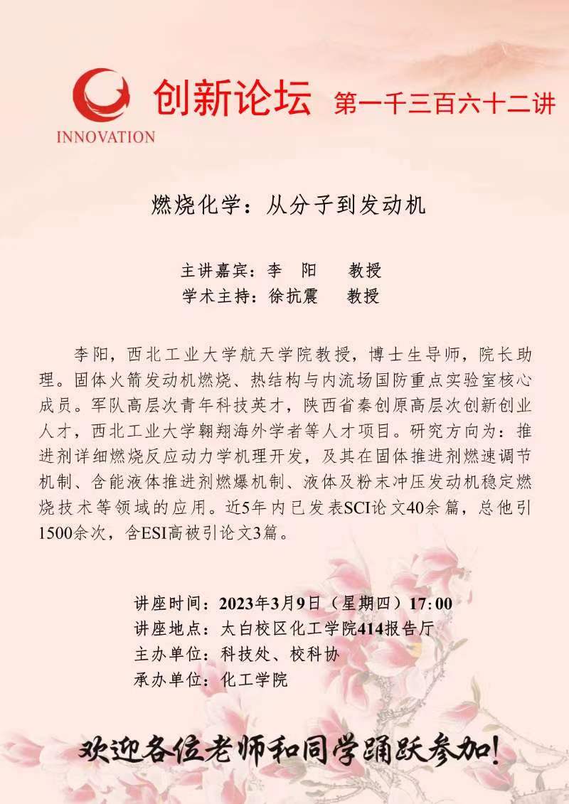 李阳 教授 伟德国际1949始于英国创新论坛第一千三百六十二讲:燃烧化学:从分子到发动机 讲座时间 2023年3月9日(星期四)17:00 讲座地点 太白校区化工学院414报告厅 讲座人介绍 李阳 教授 讲座内容