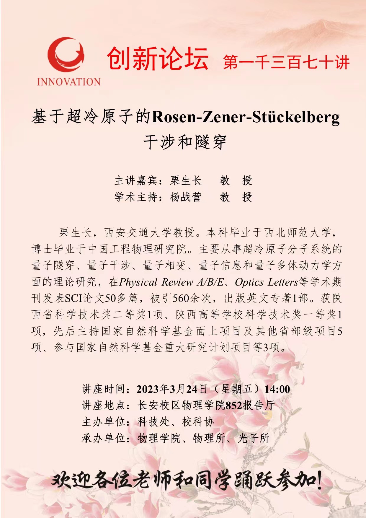 栗生长 教 授 伟德国际1949始于英国创新论坛第一千三百七十讲:基于超冷原子的Rosen-Zener-Stückelberg干涉和隧穿 讲座时间 2023年3月24日(星期五)14:00 讲座地点 长安校区物理学院852报告厅 讲座人介绍 栗生长 教 授 讲座内容