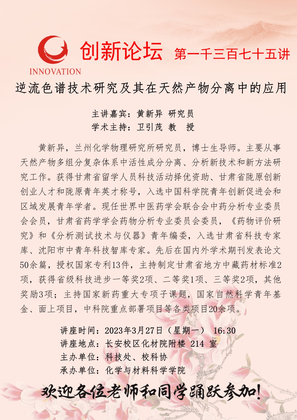 黄新异 研究员 伟德国际1949始于英国创新论坛第一千三百七十五讲:逆流色谱技术研究及其在天然产物分离中的应用 讲座时间 2023年3月27日(星期一) 16:30 讲座地点 长安校区化材院附楼214室 讲座人介绍 黄新异 研究员 讲座内容