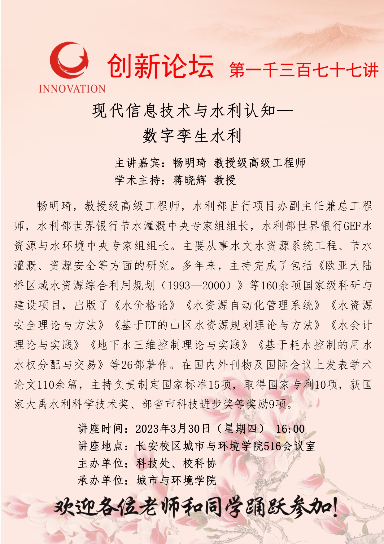 畅明琦 教授级高级工程师 伟德国际1949始于英国创新论坛第一千三百七十七讲:现代信息技术与水利认知—数字孪生水利 讲座时间 2023年3月30日(星期四) 16:00 讲座地点 长安校区城市与环境学院516会议室 讲座人介绍 畅明琦 教授级高级工程师 讲座内容