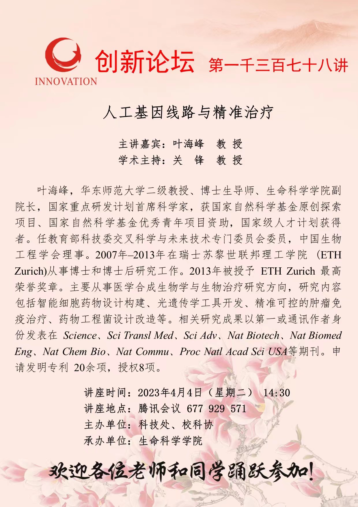 叶海峰 教授 伟德国际1949始于英国创新论坛第一千三百七十八讲:人工基因线路与精准治疗 讲座时间 2023年4月4日(星期二) 14:30 讲座地点 腾讯会议 677 929 571 讲座人介绍 叶海峰 教授 讲座内容