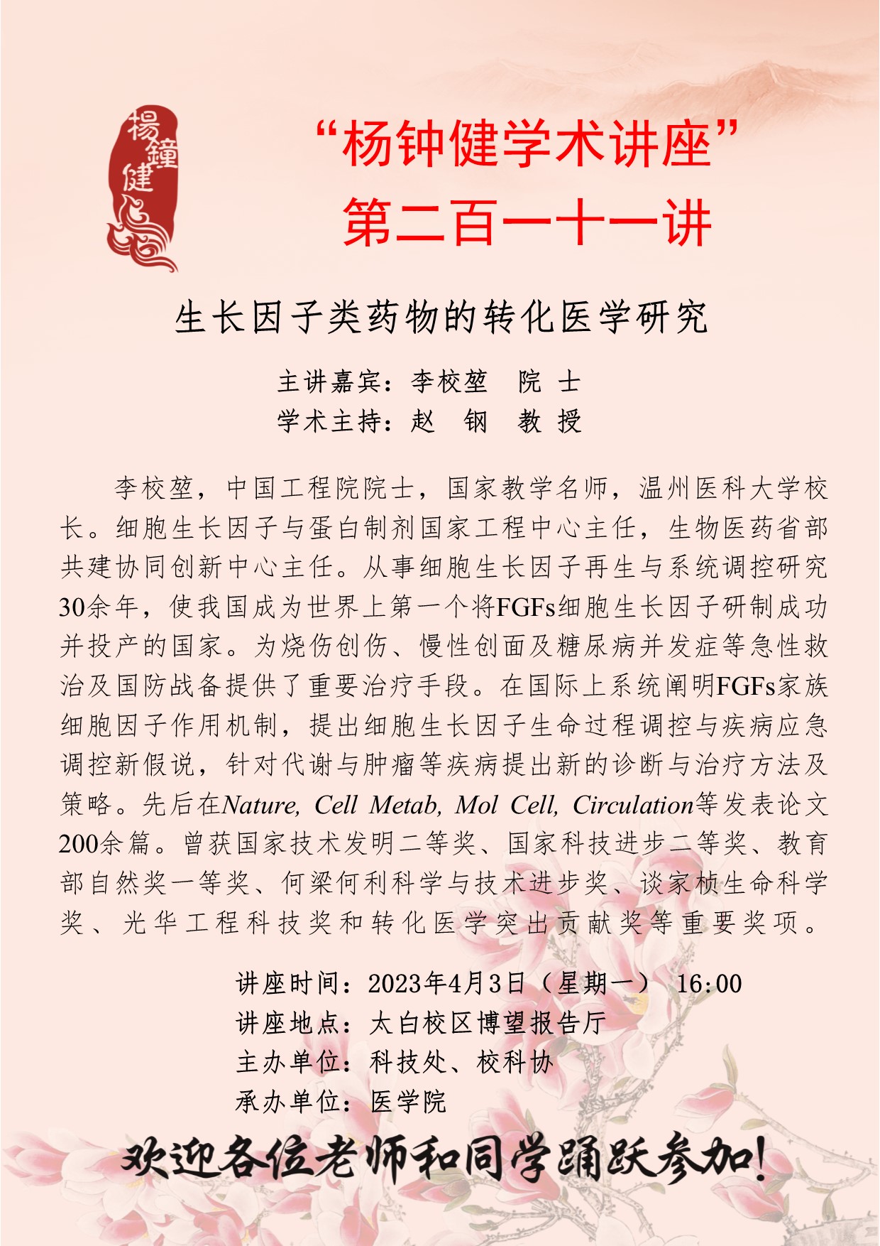 “杨钟健学术讲座”第二百一十一讲:生长因子类药物的转化医学研究